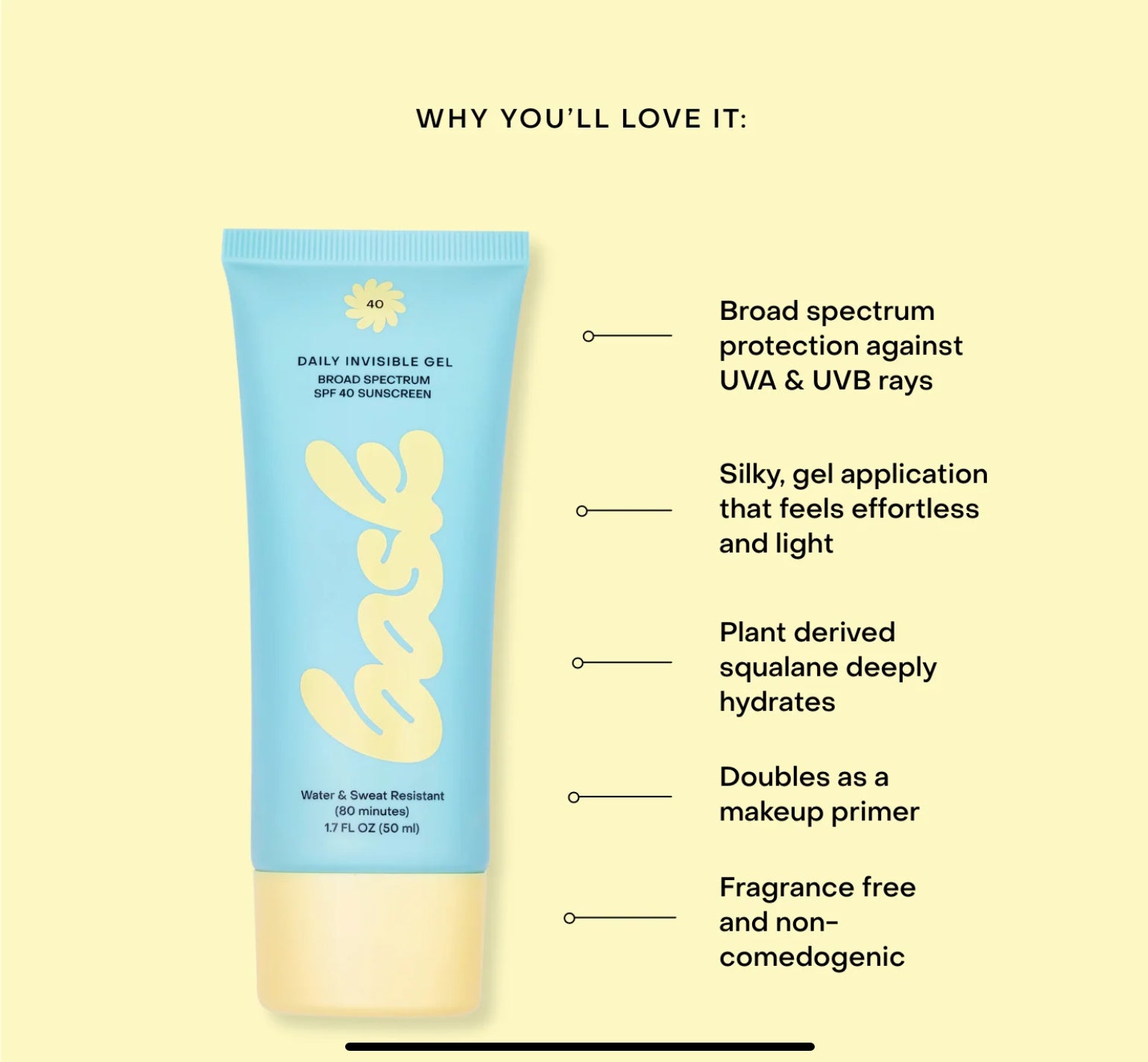 Dive into sunlit days with the soon-to-launch Invisible Gel SPF 40 by Bask Sunscreen. This revolutionary, ultra-sheer gel ensures total UV protection without any white traces, making it perfect for all skin tones. Lightweight and non-sticky, it hydrates while defending against harmful UVA & UVB rays. Committed to safety and the environment, it's chemical-free, reef-friendly, and cruelty-free. Available in a 50 ml / 1.7 fl. oz. size. Secure your pre-order now at a special price and be the first to bask in its brilliance.